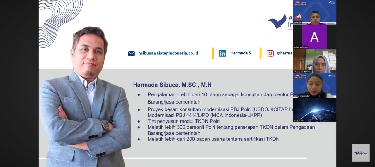 ASARPUA.com – Jakarta – Alatan Indonesia menggelar webinar bertema “Strategi Peluang Pengadaan Barang dan Jasa melalui Sertifikasi TKDN” pada Rabu, 7 Mei 2025. Acara ini menghadirkan pembicara Harmada Sibuea, ahli di bidang kebijakan publik dan pengadaan barang dan jasa pemerintah.