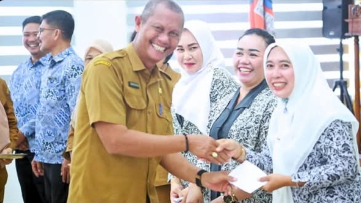 Bupati Labuhanbatu diwakili Asisten Pemerintahan Drs Sarimpunan Ritonga memberikan apresiasi kepada bidan, pada pencanangan Bulan Bakti Sosial IBI KB- Kesehatan tahun 2025, di Ruang Data dan Karya Kantor Bupati, Jalan Sisingamangaraja Rantauprapat, Selasa (27/05/2025). (Foto: Dok/Dikla)