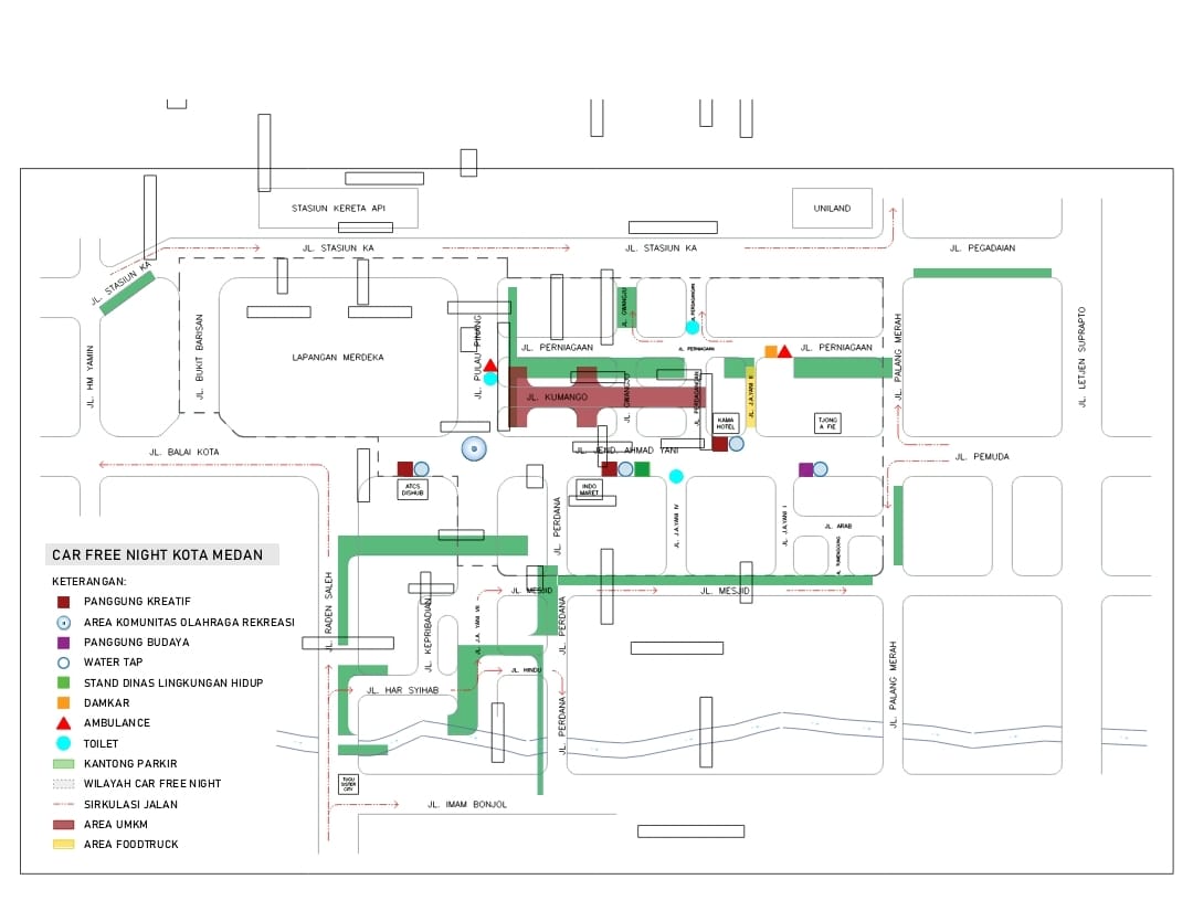 Plt Kadis Perhubungan, Suriono ketika dikonfirmasi, Jumat (27/06/2025) menjelaskan pusat kegiatan Car Free Night berada di jalan Jenderal Ahmad Yani, Kesawan. Selain itu Car Free Night juga berlangsung di seputaran kawasan Lapangan Merdeka Medan, yakni di Jalan Bukit Barisan, Jalan Stasiun dan Jalan Pulau Penang.
