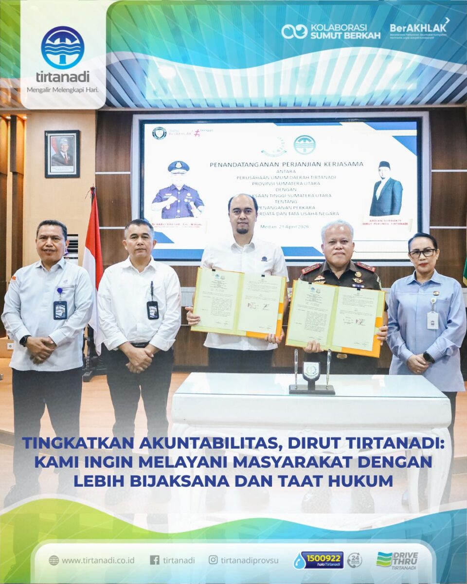 ASARPUA.com – Medan – Direktur Utama (Dirut) Perumda Tirtanadi Provinsi Sumatera Utara (Sumut), Ardian Surbakti bersama Kepala Kejaksaan Tinggi Sumatera Utara (Kajatisu) Harli Siregar, menandatangani nota kesepahaman (MoU) terkait penanganan perkara di bidang Perdata dan Tata Usaha Negara (DATUN).