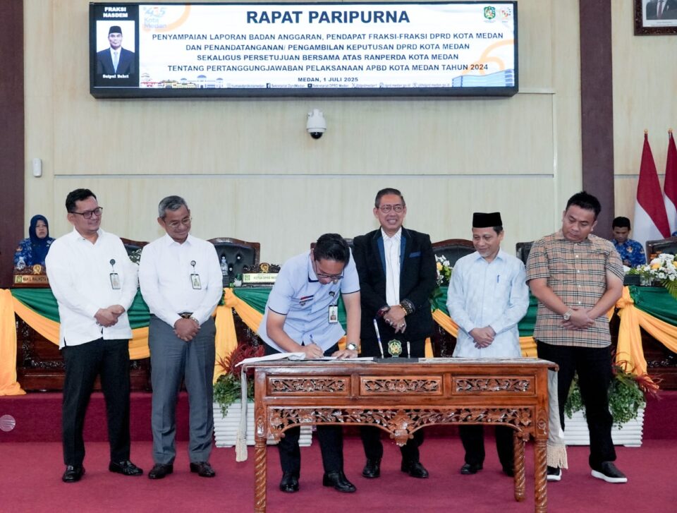 “Kami menyampaikan apresiasi kepada seluruh fraksi di DPRD Kota Medan yang telah menyampaikan pendapat akhirnya. Bahwa, substansi pendapat fraksi-fraksi sangat penting untuk peningkatan pelayanan publik dan penguatan tata kelola pemerintahan yang lebih baik,” ucapnya.