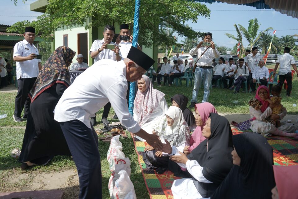 Bupati Asahan Surya memberikan santunan kepada anak yatim dan kaum dhuafa saat mengikuti pengajian akbar Attahadul Amam di Desa Teluk Dalam, Kecamatan Teluk Dalam, Rabu (11/09/2024). (Foto. Asarpua.com/dikas)