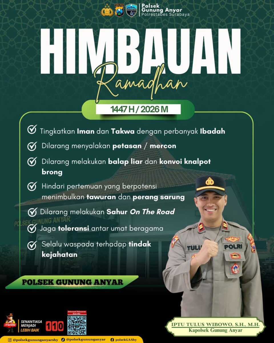 ASARPUA.com – Surabaya – Kapolsek Gunung Anyar Iptu Tulus Wibowo mengeluarkan himbauan kamtibmas selama Ramadhan 1447 Hijriah guna menjaga keamanan dan ketertiban masyarakat (kamtibmas) di wilayah Kecamatan Gunung Anyar, Kota Surabaya.
