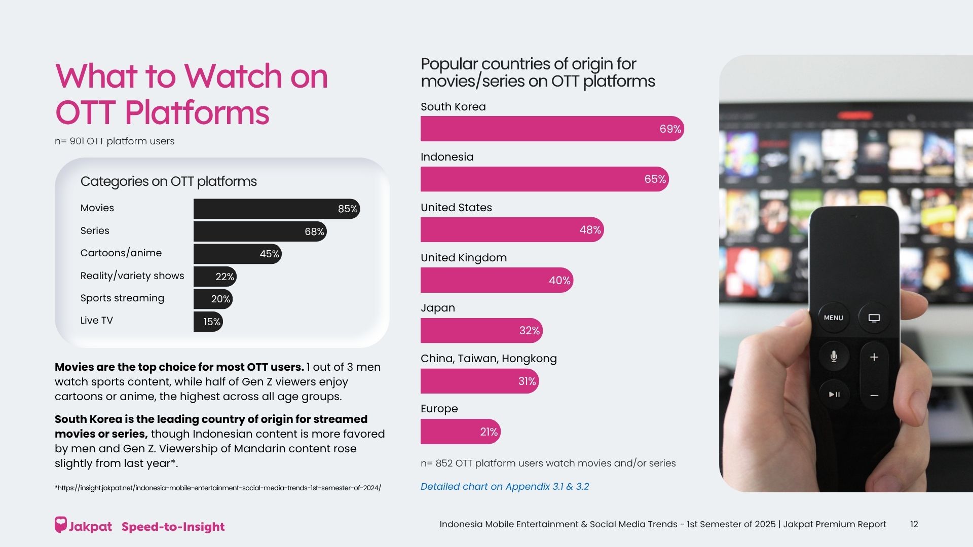 Terdapat berbagai jenis konten yang dicari pengguna di media sosial. Topik yang paling populer meliputi musik, film, atau serial (62%), kuliner (59%), dan perjalanan (54%). Konten-konten ini cukup menarik bagi Gen X, sementara tema memasak lebih banyak diminati oleh Milenial dan Gen Z.