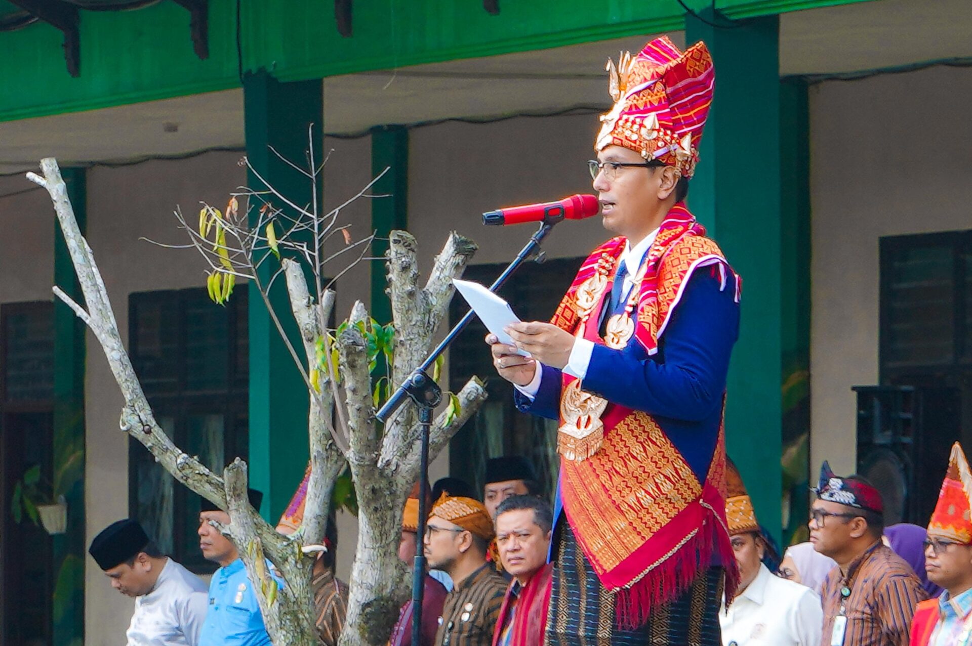 Dengan mengenakan busana adat Karo, Walikota Medan Rico Waas memimpin upacara Hari Pendidikan Nasional, Jumat (02/05/2025) di SMP Negeri I Medan. (Foto. Asarpua.com/dikdan)
