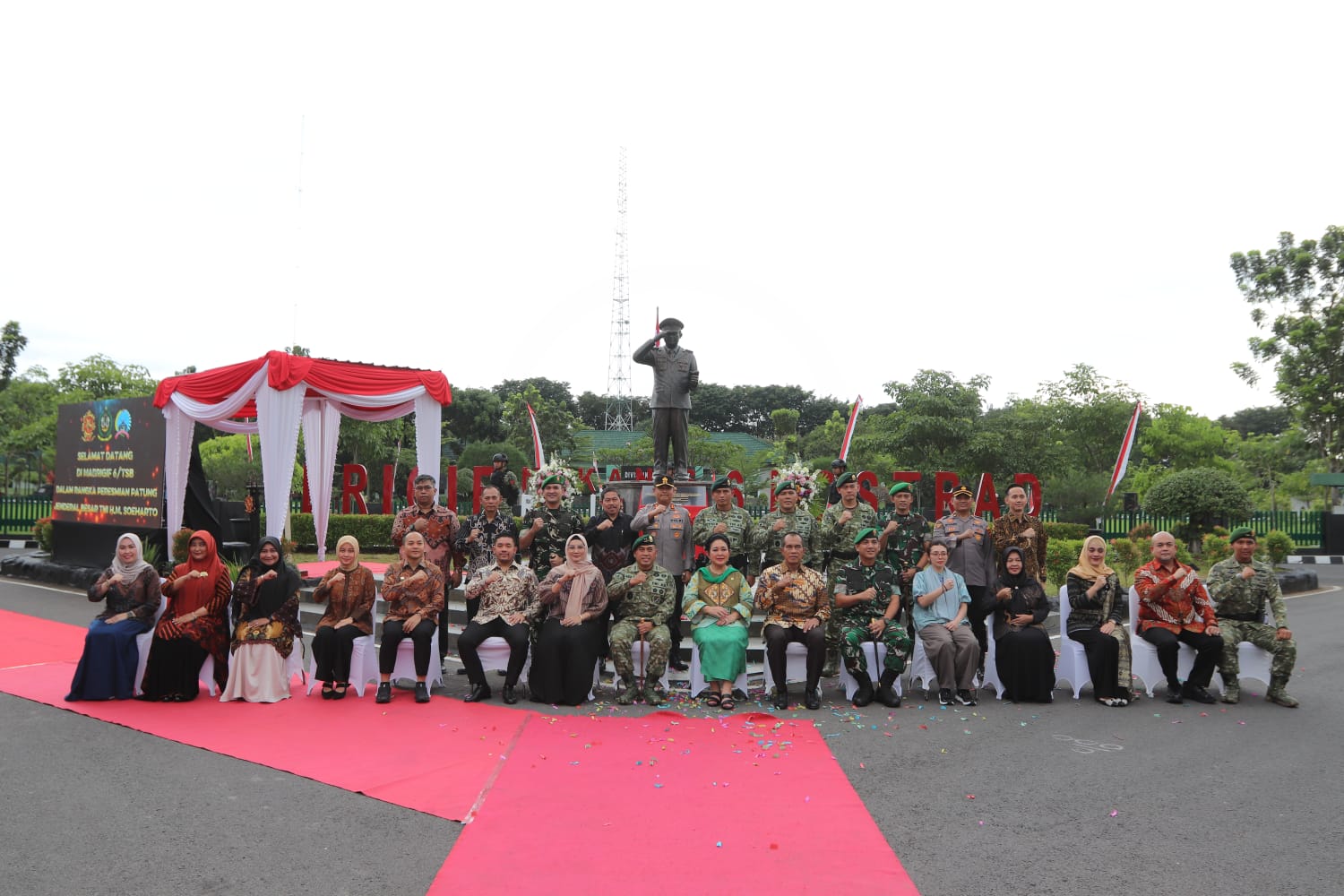 Patung Jenderal Besar TNI H.M. Soeharto diresmikan di Markas Brigade Infanteri 6/TSB/2 Kostrad dalam sebuah acara yang berlangsung khidmat dan penuh makna. Peresmian dipimpin oleh Panglima Divisi Infanteri 2 Kostrad, Mayjen TNI Primadi Saiful Sulun bersama Ibu Siti Hediati Hariyadi (Ibu Titiek Soeharto). (Foto. Asarpua.com/ pendam)