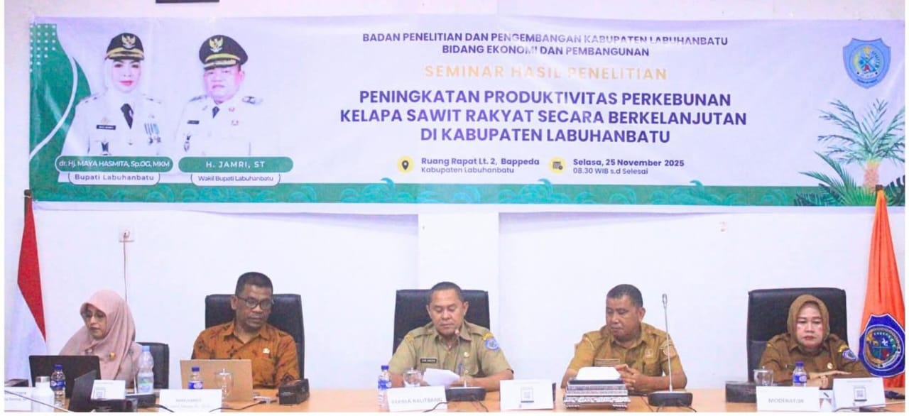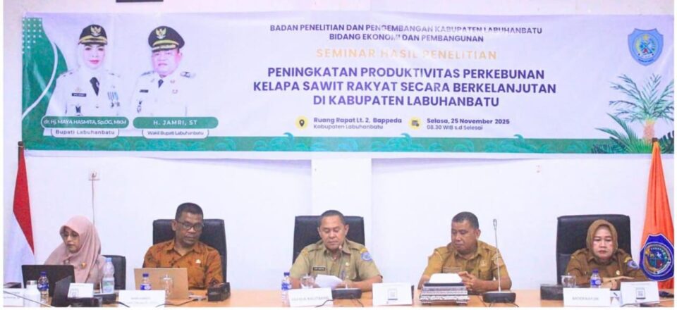 ASARPUA.com – Labuhanbatu – Pemerintah Kabupaten (Pemkab) Labuhanbatu menggelar Seminar Hasil Penelitian tentang Peningkatan Produktivitas Perkebunan Kelapa Sawit Rakyat Secara Berkelanjutan. Seminar yang dilakukan Badan Penelitian dan Pengembangan (Balitbang), Dinas Pertanian bersama tim peneliti dari lembaga akademik, berlangsung di Kantor Bupati, Jalan Sisingamangaraja Rantauprapat, Selasa (25/11/2025).