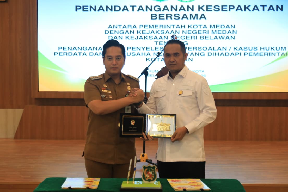 Kerja sama ini ditandai dengan penandatanganan Kesepakatan Bersama Antara Pemko Medan dengan Kejaksaan Negeri Medan dan Kejaksaan Negeri Belawan Tentang Penanganan dan Penyelesaian Persoalan/Kasus Hukum Perdata dan Tata Usaha Negara Yang Dihadapi Pemerintah Kota Medan, di Rumah Dinas Walikota Medan, Selasa (10/02/2026).