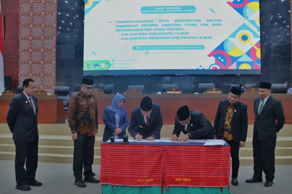 Hal tersebut ditandai dengan penandatanganan Nota Kesepakatan oleh Penjabat (Pj) Gubernur Sumut Agus Fatoni dan Ketua DPRD Sumut Sutarto. Kegiatan ini disaksikan oleh Wakil DPRD Sumut Rahmsyah Sibarani, dan Misno Adisyah Putra, anggota Fraksi-fraksi DPRD Sumut, Forkopimda, serta seluruh Organisasi Perangkat Daerah (OPD) Pemprov Sumut.