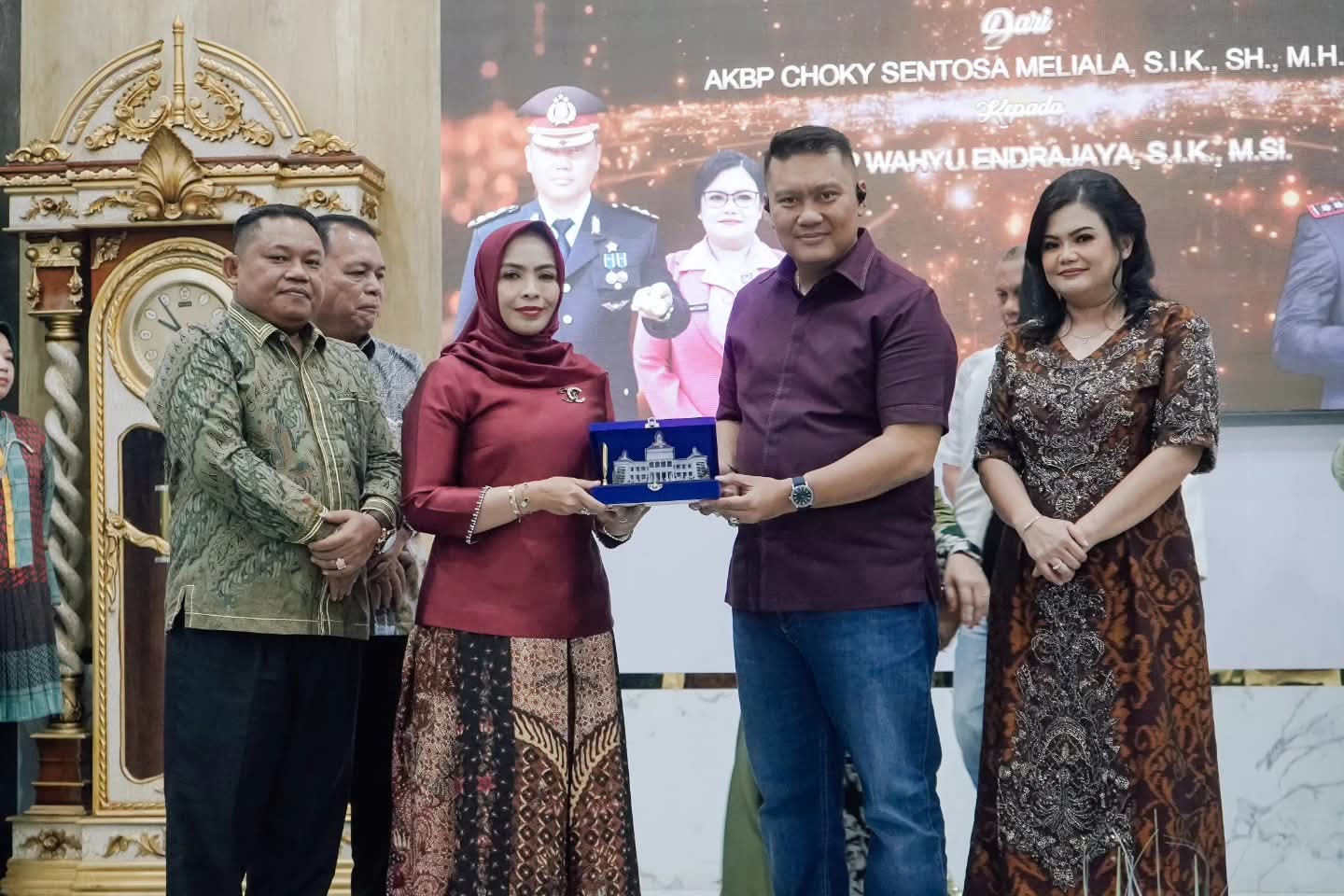 Bupati Labuhanbatu Maya Hasmita didampingi Wabup Jamri dan Sekda Hasan Heri Rambe memberikan cenderamata kepada AKBP Choky Sentosa Meliala dan istri, Rina Choky, pada acara kenal-pamit Kapolres, di Pendopo Rumah Dinas Bupati, Jalan WR Supratman, Rantauprapat, Selasa (13/01/2026) malam. (Foto: Asarpua.com/Dikla)