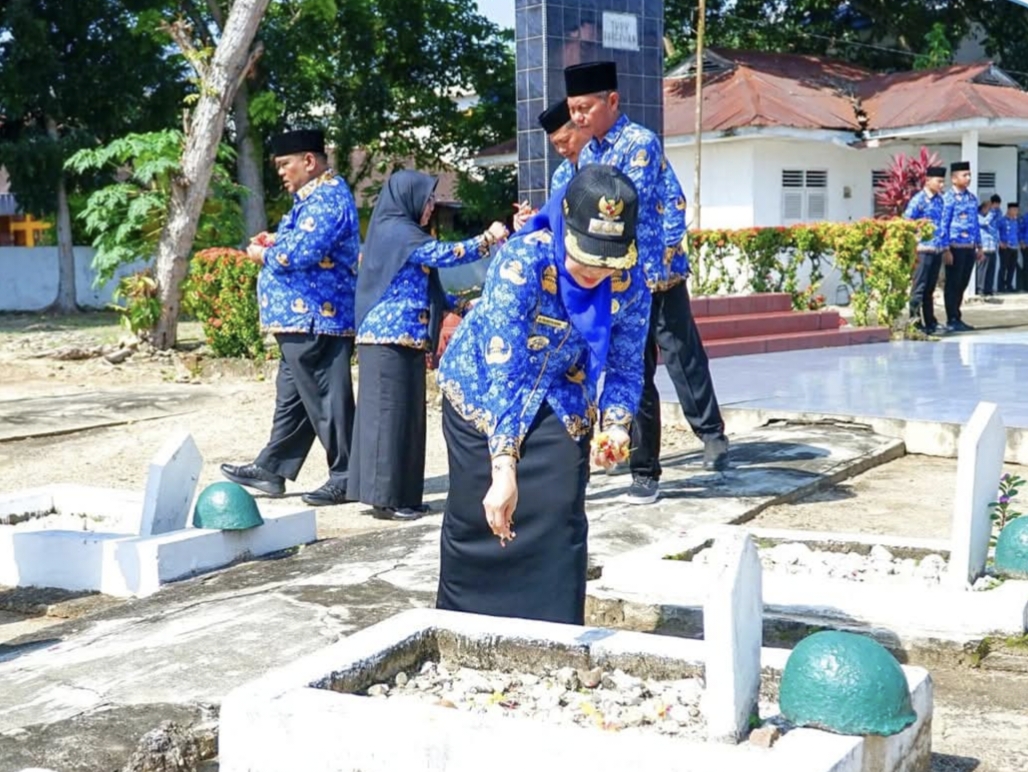 Seusai upacara, Bupati Labuhanbatu dr Hj Maya Hasmita SpOG bersama Ketua Korpri Labuhanbatu, pengurus beserta anggota pergi berziarah ke Taman Makam Pahlawan (TMP) di Jalan Ahmad Yani, Rantauprapat.