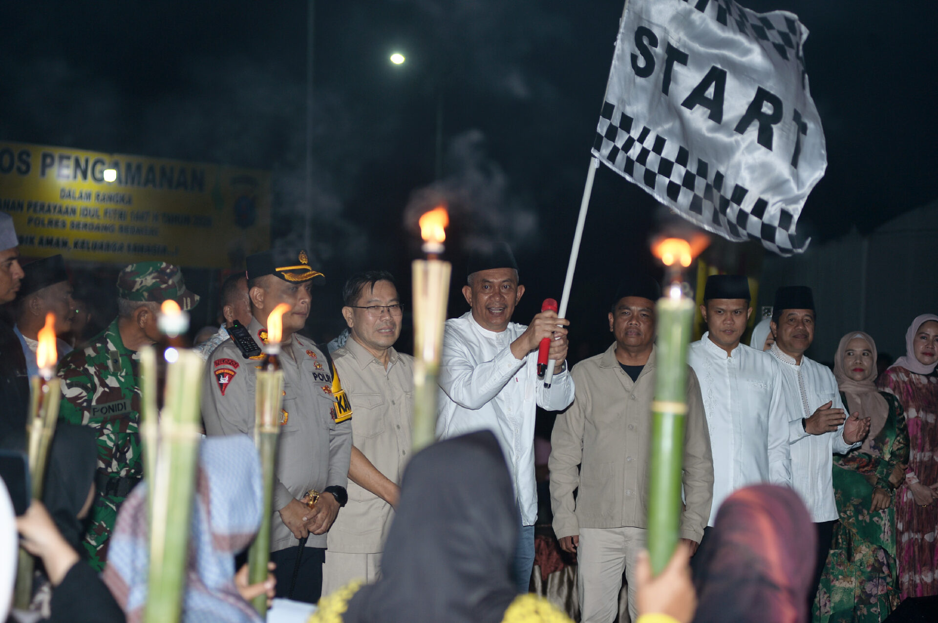 “Bismillahirrahmanirrahim, atas nama Gubernur Sumatera Utara (Gubsu), saya selaku Penjabat Sekretaris Daerah Provinsi Sumatera Utara (Pj Sekdaprovsu) dengan resmi melepas Pawai Obor dan Gema Takbir Kabupaten Serdangbedagai (Sergai) dalam rangka memeriahkan malam 1 Syawal 1447 Hijriah,” ucap Pj Sekdaprovsu Sulaiman Harahap, saat melepas pawai di Alun-alun Masjid Agung Sergai Jalan Lintas Medan–Tebingtinggi, Kecamatan Teluk Mengkudu, Kabupaten Sergai, Jumat (20/03/2026).