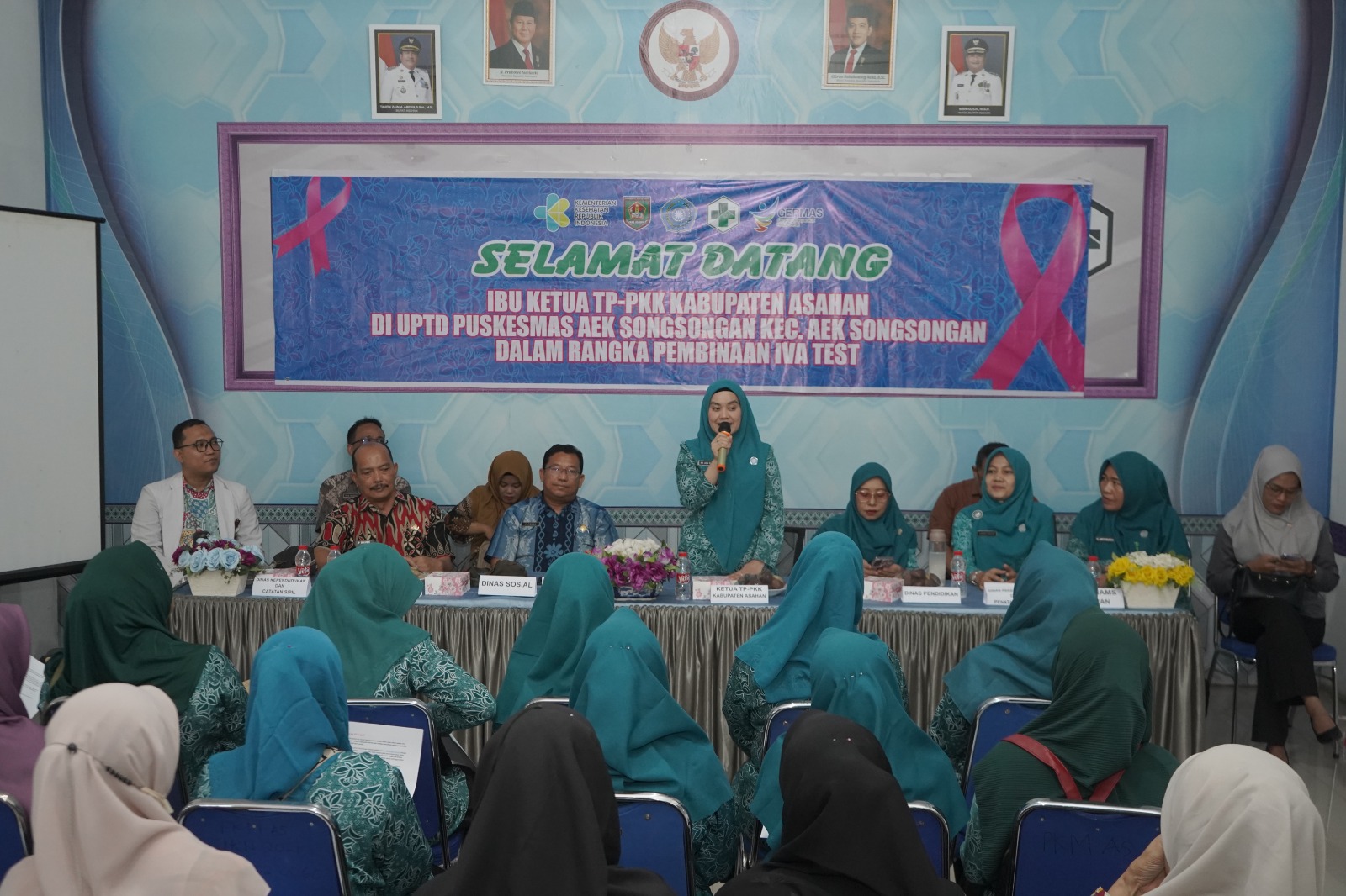 Dalam sambutannya, Ny. Juni Rianto menyampaikan salam dari Ketua TP PKK Kabupaten Asahan, Ny. Yusnila Indriati Taufik, serta mengajak masyarakat untuk terus memperkuat kesadaran dan partisipasi terhadap pemeriksaan IVA. Ia juga memberikan apresiasi kepada kader PKK dan tenaga kesehatan di Kecamatan Aek Songsongan yang telah bekerja dengan semangat dan komitmen tinggi. “Kesadaran untuk melakukan pemeriksaan IVA adalah bentuk cinta kepada diri sendiri dan keluarga. Mari kita jadikan gerakan ini sebagai budaya sehat bagi perempuan Asahan”, ujarnya.