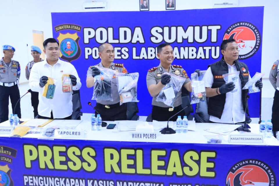 “Para tersangka dan barang bukti saat ini telah diamankan dan dibawa ke Polda Sumatera Utara untuk pengembangan dan proses hukum lebih lanjut,” kata AKBP Wahyu didampingi Wakapolres Kompol Panggil Simbolon, Kasat Resnarkoba AKP Hardiyanto, Kasat Reskrim AKP M Jihad, Kaurbin Ops Satresnarkoba Iptu Ropensus Manik, Kanit I Ipda Sastrawan Ginting dan Kanit II Ipda Risnal Situngkir.