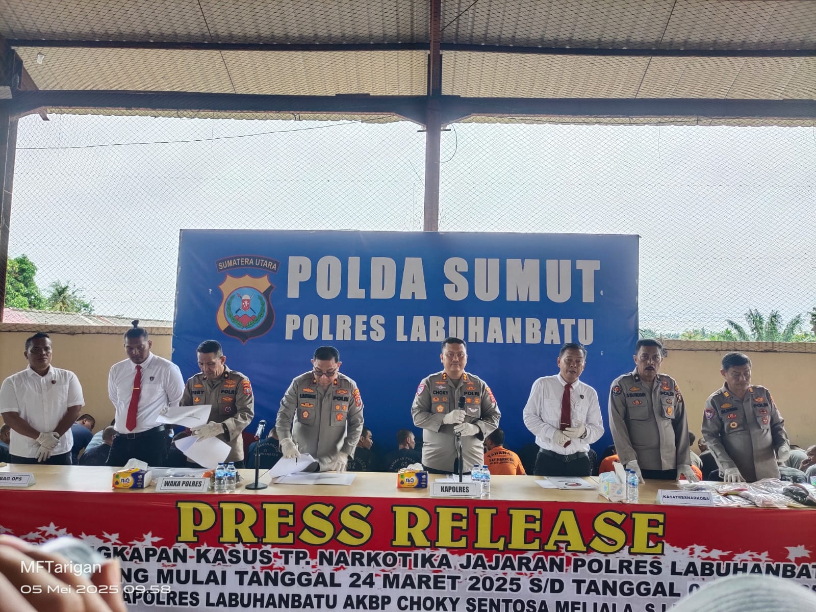 “Dalam waktu 42 hari sejak 24 Maret sampai 4 Mei 2025, jajaran Polres Labuhanbatu mengungkap 62 kasus tindak pidana narkotika, dan mengamankan 66 tersangka, terdiri dari 64 laki-laki dan 2 perempuan, yang diduga kuat terlibat dalam jaringan peredaran gelap Narkoba di wilayah hukum Polres Labuhanbatu, meliputi Kabupaten Labuhanbatu dan Kabupaten Labuhanbatu Utara (Labura),” kata Kapolres Labuhanbatu, AKBP Choky Sentosa Meliala, saat konferensi pers hasil capaian signifikan jajaran Polres Labuhanbatu dalam upaya pemberantasan tindak pidana narkotika, Senin (05/05/2025), di Gedung Serbaguna Mapolres Labuhanbatu, Jalan MH Thamrin Rantauprapat.
