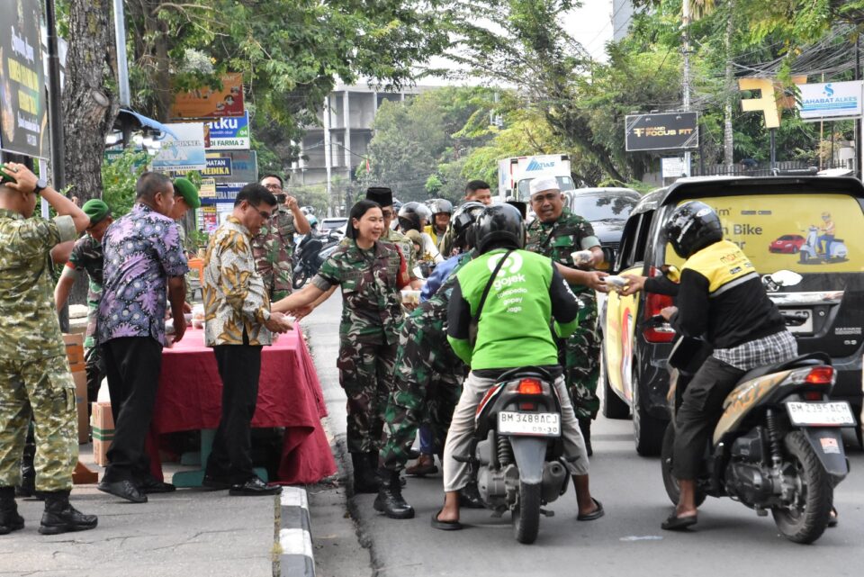 Pembagian takjil dilakukan oleh jajaran prajurit Korem 031/WB kepada pengendara roda dua, roda empat, serta warga yang melintas di kawasan Makorem menjelang waktu berbuka puasa.