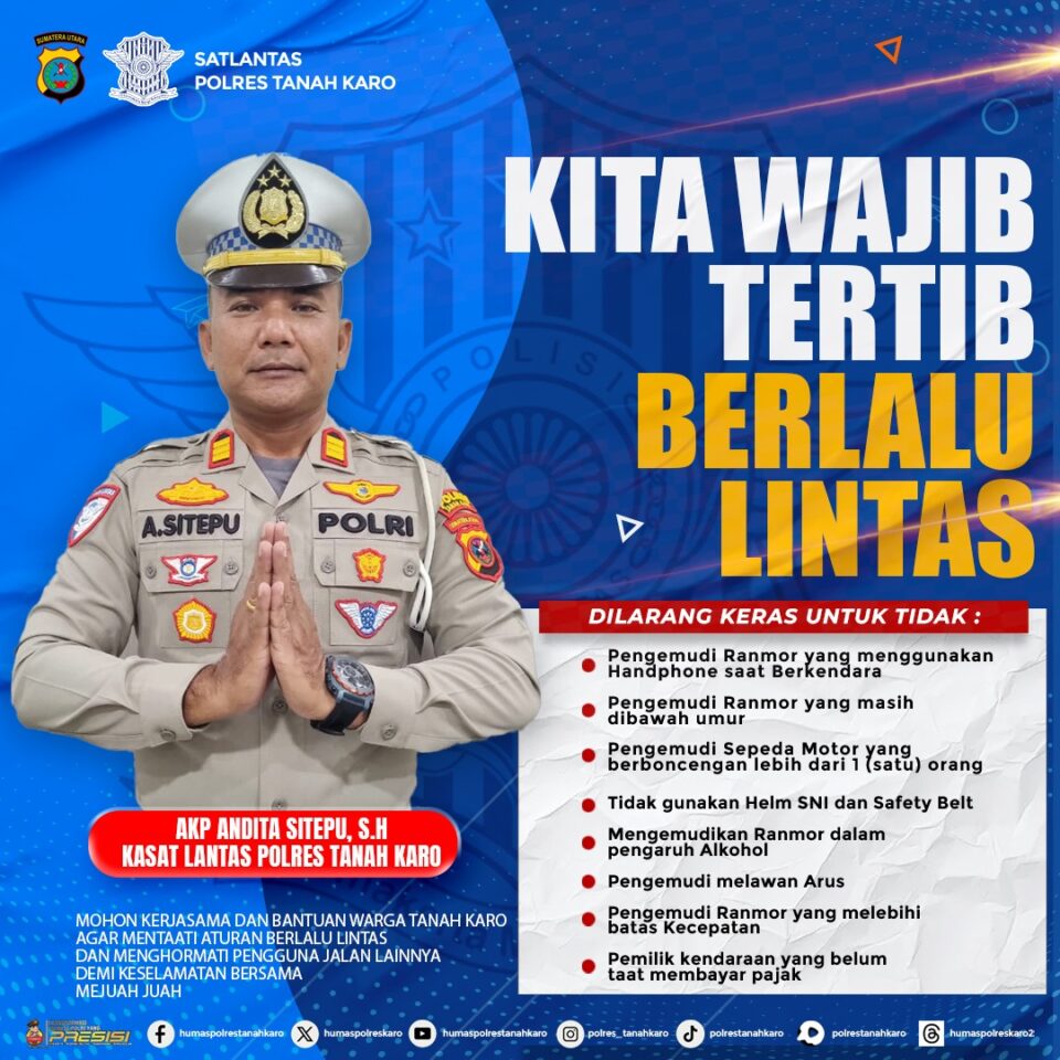 ASARPUA.com – Karo – Polres Tanah Karo melalui Satuan Lalu Lintas terus menggalakkan imbauan keselamatan berkendara kepada seluruh masyarakat. Kasat Lantas Polres Tanah Karo, AKP Andita Sitepu, menyampaikan ajakan kepada pengguna jalan untuk selalu mematuhi aturan demi menjaga keselamatan bersama.