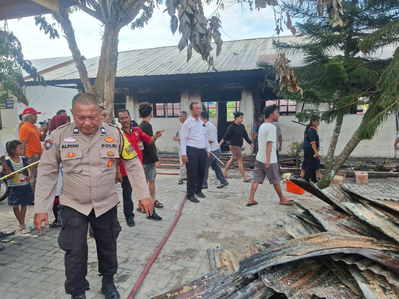 Pihak SPK Polres Labuhanbatu mengamankan barang bukti untuk penyelidikan penyebab kebakaran yang menghanguskan 5 ruang kelas dan 2 gudang SDN 14 Rantau Utara, Jalan Menara Rantauprapat, Kabupaten Labuhanbatu, Senin (25/08/2025). (Foto: Asarpua.com/humas)