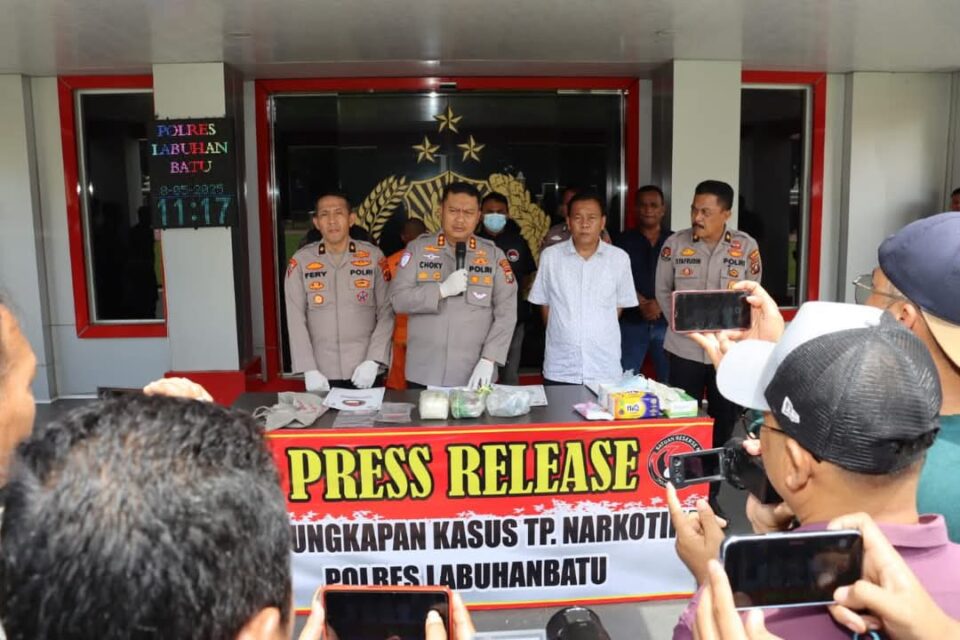 “Polres Labuhanbatu berkomitmen memerangi peredaran gelap narkotika. Tim Satuan Reserse Narkoba (Satresnarkoba), kemarin menangkap seorang tersangka Narkoba berinisial AH alias Agus (34), warga Jalan Sirandorung, Gang PGA, Kota Rantauprapat,” kata Kapolres AKBP Choky Sentosa Meliala didampingi Kabag Ops Kompol Ferimon, Kasi Humas Kompol Syafrudin dan Kasat Resnarkoba AKP Sopar Budiman dalam konferensi pers, Kamis (08/05/2025), di Mapolres, Jalan MH Thamrin Rantauprapat.
