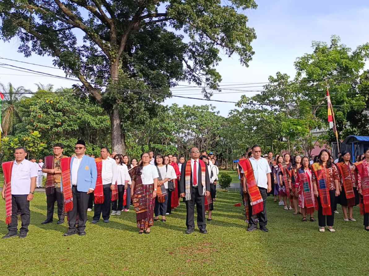 Nuansa khas budaya lokal ini membuat upacara bendera tak hanya sekadar seremonial, melainkan juga perayaan jati diri. Rektor UHKBPNP Dr. Muktar Panjaitan, M.Pd., bersama jajaran pimpinan universitas, guru, hingga siswa SMA hadir dengan penuh khidmat, seolah menegaskan bahwa cinta tanah air dan cinta budaya bisa berjalan beriringan.