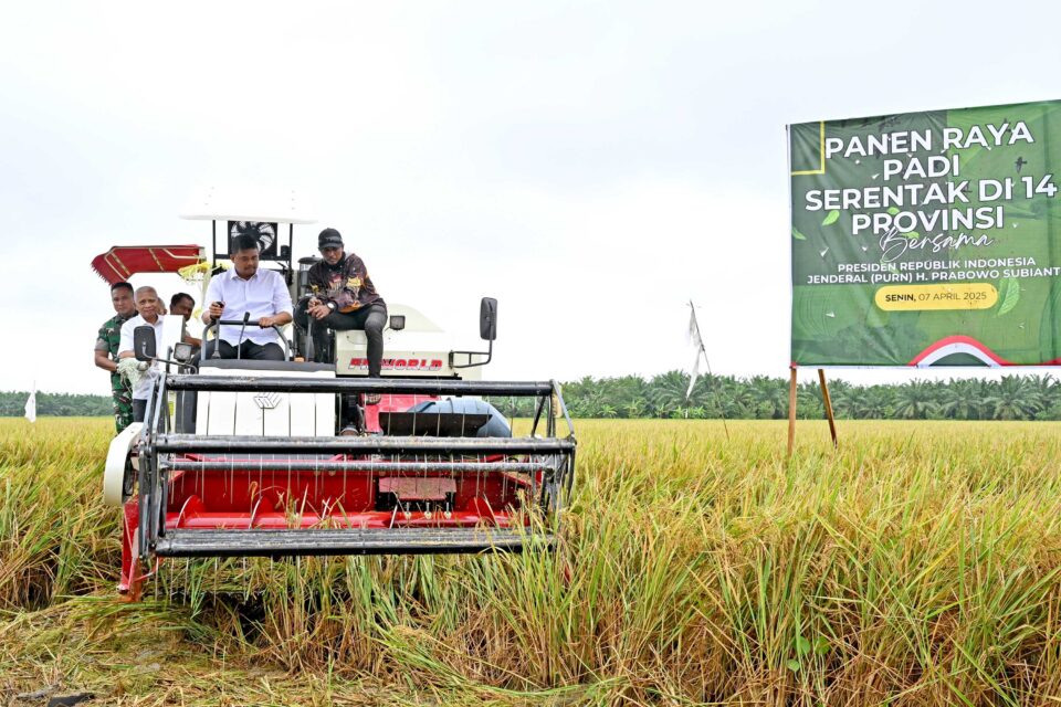 Gubsu Bobby Nasution mengoperasikan mesin pemanen padi bersama Wagubsu Surya, Pangdam I Bukit Barisan Mayjend TNI Rio Firdianto dan Bupati Sergai Darma Wijaya saat Panen Raya Padi Serentak di 14 Provinsi se Indonesia di Desa Paya Mabar, Kecamatan Tebingtinggi, Kabupaten Sergai, Senin (07/04/2025). (Foto. Dok/Diksu)